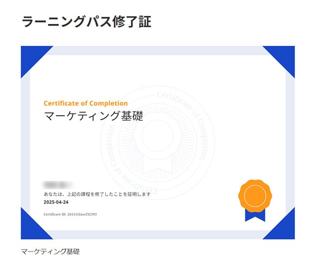 上の写真はラーニングパス「マーケティング基礎」の修了証です。すべてのカリキュラムを修了すると、修了証が授与されます。